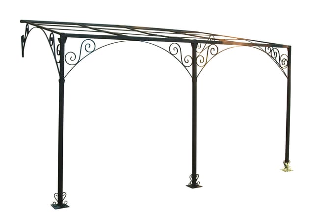 Structure en fer forgé très robuste (102kg) Traitement anti-corrosion Visserie Inoxydable Pilier central percé pour passage d’un éventuel câble électrique Barre spéciale pour pose d’une bâche (bâche beige 4 x 3 m. H. 2.70 m à l’arrière, 2.20 m à l’avant, vendue séparément)