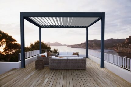 Pergola autoportée bioclimatique motorisée 4×3,5 m en aluminium – gris