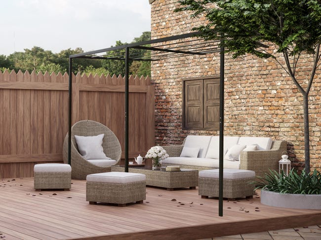 Pergola 3x3m en aluminium avec fixation mur et sol servant de support a toute couverture dite légère (moins de 30kgs) type canisse, bambou, toile ou végétale