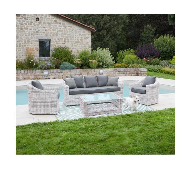 Salon de jardin Phuket 5 places : Confort et élégance pour votre extérieurImaginez-vous profiter des longues soirées d’été avec vos proches, confortablement installé dans le salon de jardin Phuket 5 places. Ce salon en résine tressée est idéal pour créer un espace détente chic et chaleureux sur votre terrasse ou dans votre jardin. Conçu pour résister aux éléments tout en offrant un confort optimal, il se distingue par ses coussins épais en polyester anthracite et ses assises spacieuses. Adoptez le salon de jardin Phuket et transformez votre extérieur en un véritable coin de paradis.un salon de jardin modulable en résine tresséeLe salon de jardin Phuket est conçu pour s’adapter à toutes les configurations d’espaces extérieurs grâce à sa modularité. Composé d’un canapé trois places, de deux fauteuils individuels et d’une table basse rectangulaire avec plateau en verre trempé, ce salon offre de nombreuses possibilités d’agencement. Avec ses dimensions généreuses – fauteuils de 77 x 80 x 80 cm, canapé de 195 x 80 x 80 cm, et table basse de 120 x 60 x 45 cm – il permet d’accueillir jusqu’à cinq personnes confortablement. La résine tressée, matériau résistant et facile à entretenir, est parfaite pour un usage extérieur. Elle conserve son éclat au fil du temps, résistant aux rayons UV et aux intempéries. Opter pour le salon de jardin Phuket, c’est choisir la durabilité sans sacrifier le style. retrouvez également ce salon de jardin en version 4 places ou 7 places. Modulez-le à votre guise en ajoutant une banquette de jardin 2 places, un pouf extérieur ou encore des fauteuils de jardin phuket