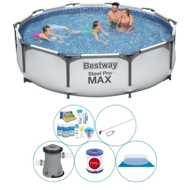 Avec la belle et grande piscine Steel Pro MAX de Bestway, invitez les vacances chez vous! Cette piscine ronde et durable est facile à installer et est fabriquée en matériaux solides. Grâce au puissant revêtement Duraplus, la piscine est très solide et le risque de l’endommager minime. La piscine peut accueillir jusqu’à 5 personnes. Elle dispose d’un cadre en acier inoxydable et d’une valve de vidange permettant de la vider aisément à la fin de l’été. En un mot: un vrai atout pour votre jardin!Ce kit contient tout ce dont vous avez besoin pour installer et entretenir votre piscine de manière optimale.