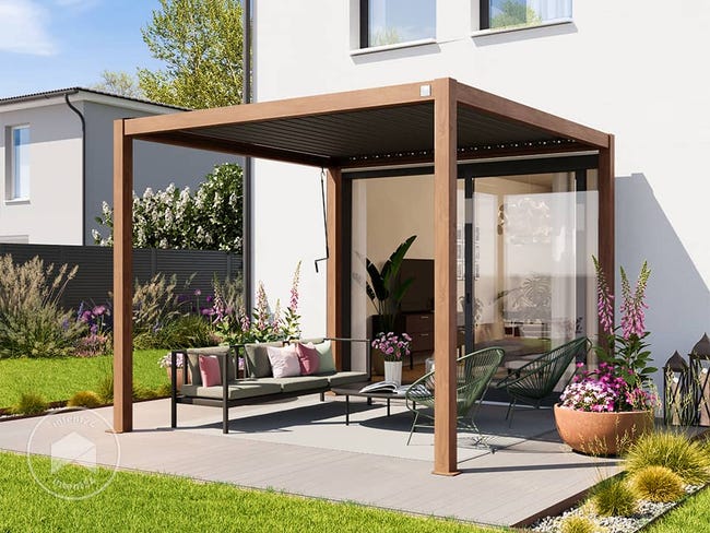 Accueil Pergola aluminium PRIMEYARD Pergola 3×3 m poteaux aspect bois en aluminium avec lames orientables en acier pavillon