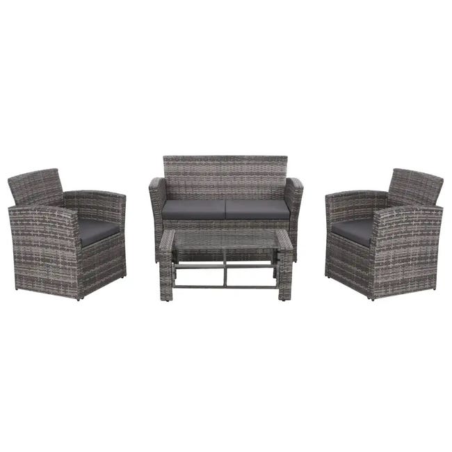Cet ensemble en résine tressé apportera un grand confort à votre jardin ou patio.Il est disponible en 2 pièces, 4 pièces et 8 pièces.Grâce à la résine tressée résistante à l’eau, l’ensemble est facile à nettoyer, résistant à l’usure et convient à une utilisation quotidienne à l’extérieur. Les cadres en acier enduit de poudre rendent l’ensemble robuste, stable et d’une grande légèreté. Cet ensemble est également livré avec des coussins de siège très confortables et épaissement rembourrés pour un confort ultime. Cet ensemble est facile à assembler.Remarque : nous vous recommandons de couvrir l’ensemble pendant la pluie, la neige et le gel pour une meilleure longévité. Caractéristiques :Ensemble 4 pièces :Couleur : gris et gris foncéMatériau : résine tressée (polyéthylène) + cadre en acier enduit de poudreMatériau de la housse du coussin : 100 % PolyesterÉpaisseur du coussin : 6 cmDimensions de la table basse : 85x50x37 cm (LxlxH)Canapé à 2 places :Dimensions : 110x61x76,5 cm (lxPxH)Largeur du siège : 97 cmProfondeur de siège : 49 cmHauteur du siège à partir du sol sans le coussin : 34 cmHauteur de l’accoudoir à partir du sol : 60 cmFauteuil :Dimensions : 70x61x76,5 cm (lxPxH)Largeur du siège : 49 cmProfondeur de siège : 49 cmHauteur du siège à partir du sol sans le coussin : 34 cmHauteur de l’accoudoir à partir du sol : 60 cmHousse de coussin lavableFacile à assemblerLa livraison comprend :1xcanapé à 2 places2xfauteuil1xtable basse4xcoussin de siège Ensemble 8 pièces :Couleur : gris et gris foncéMatériau : résine tressée (polyéthylène) + dessus de table en verre + cadre en acier enduit de poudreMatériau de la housse du coussin : 100 % PolyesterÉpaisseur du coussin : 6 cmDimensions de la table basse : 74x74x26 cm (LxlxH)Dimensions du repose-pied : 70x70x26 cm (lxPxH)Canapé d’angle :Dimensions : 70x70x54 cm (lxPxH)Largeur du siège : 59 cmProfondeur du siège : 59 cmHauteur du siège à partir du sol sans le coussin : 26 cmCanapé central :Dimensions : 70x70x54 cm (lxPxH)Largeur du siège : 69,5 cmProfondeur du siège : 59 cmHauteur du siège à partir du sol sans le coussin : 26 cmHousses de coussins lavablesFacile à assemblerLa livraison comprend :1xcanapé d’angle3xcanapé de centre1xtable basse3xrepose-pied5xcoussin7xcoussin de siège Ensemble 2 pièces :Couleur : gris et gris foncéMatériau : résine tressée (polyéthylène) + cadre en acier enduit de poudreMatériau de la housse du coussin : 100 % PolyesterÉpaisseur du coussin : 5 cmDimensions du tabouret : 106/133x56x30 cm (lxPxH)Dimensions du canapé à 2 places : 123x65x72 cm (lxPxH)Largeur du siège : 107 cmProfondeur du siège : 57 cmHauteur du siège à partir du sol sans le coussin : 27 cmHauteur des accoudoirs à partir du sol : 56 cmFacile à assemblerLa livraison comprend :1xcanapé à 2 places1xrepose-pied5xcoussin