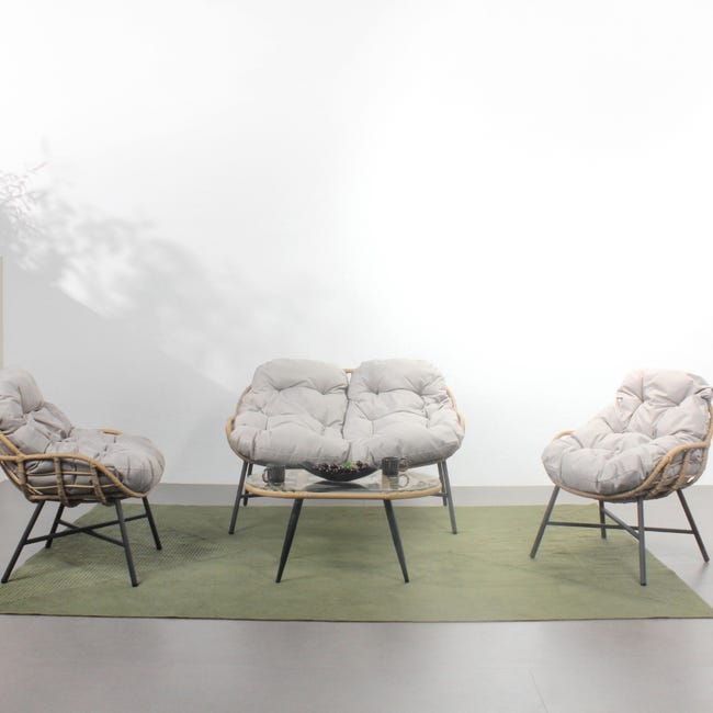 Sublimez votre espace extérieur avec ce salon de jardin. Composé de deux fauteuils et d’un canapé 2 places en effet rotin, cet ensemble ajoute une touche d’élégance et de confort à votre terrasse ou jardin. Les généreux coussins beiges offrent un accueil douillet pour des instants de détente inégalés. Avec sa table basse ovale, pratique et esthétique, ce superbe salon de jardin est l’invitation parfaite à des moments conviviaux entre amis ou en famille, dans un cadre aussi stylé que confortable.