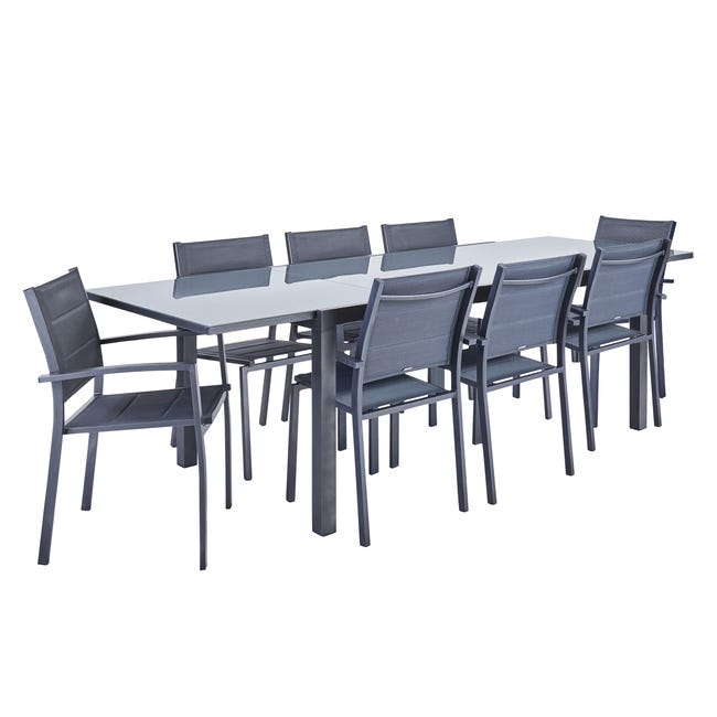 L’ensemble de jardin Naterial Lyra II UP/DOWN est composé d’une table et de fauteuils anthracite, et vous permet de recevoir jusqu’à 8 invités. Son plateau coulisse pour laisser apparaître une extension de 80 cm d’une table de 180×90 cm à une longueur généreuse de 2m60, le verre lisse est facile à nettoyer et résiste aux intempéries. Le fauteuil Naterial Orion Beta II est idéal pour vos repas sur la terrasse. Il s’adapte partout et complète facilement un ensemble de mobilier design. L’aluminium, le matériau principal est résistant à la rouille et aux intempéries. Pour gagner en stabilité la table est équipée d’un pied réglable qui compense les irrégularités de votre terrasse. Vous pouvez dîner sur une table confortable et fonctionnelle sans renoncer à votre propre style. Pour prolonger la durée de vie de votre table, pensez à la recouvrir d’une housse pour la protéger des agressions de l’hiver.