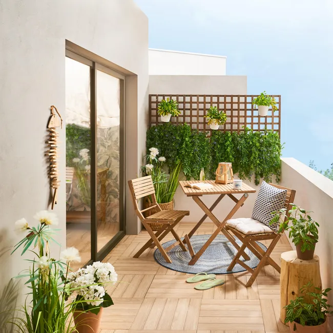 “Idéal pour les balcons et les terrasses étroites, l’ensemble Solis vous permet de profiter d’un coin repas à l’extérieur. Un ensemble pratique au quotidien Parfait pour les petits espaces, il est composé d’une table carrée de 55 x 55 cm et de deux chaises. Ainsi installés, vous pouvez partager un repas convivial au soleil. L’ensemble Solis est intégralement composé de bois d’acacia véritable issu de forêts certifiées pour leur gestion responsable et durable. Proche du teck, ce bois dispose d’une grande densité qui le rend résistant à l’humidité, aux rayons UV et aux variations de l’environnement extérieur. Pratique au quotidien, l’ensemble Solis est conçu pour vous garantir un rangement facile. Compactes, les chaises et la table se plient en un clin d’œil pour vous laisser encore plus de place. Des lignes naturelles Issu de la collection du même nom, l’ensemble Solis possède un style naturel et élégant. De fines lames composent le dossier et l’assise des chaises, ainsi que le plateau de la table pour assurer l’harmonie de l’ensemble. Combinez votre ensemble au parasol de balcon Arkea Taupe Moon. Une simplicité d’entretien Pour un ensemble durable, il est conseillé d’hiverner l’ensemble lors des longues périodes d’inutilisation. Préservez sa belle couleur dorée en appliquant annuellement un dégriseur. Enfin, en raison de la nature vivante du bois, il est préconisé de resserrer annuellement les vis de votre ensemble. Son plus environnemental L’acacia est un matériau vivant, 100% recyclable. Il est certifié issu de forêts dont la gestion est reconnue responsable et durable sur les trois domaines : social, environnemental et économique. Face aux alertes environnementales liées à la déforestation, un contrôle par un organisme indépendant permet d’assurer la traçabilité des produits via une politique bois stricte afin d’en garantir l’origine légale et responsable. Basé au Vietnam, notre fournisseur est engagé depuis 2009 dans la démarche de certification et a construit des partenariats durables avec des sous-traitants et fournisseurs locaux.