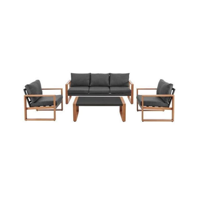 Cet agréable salon de jardin de couleur gris foncé possede une structure en aluminium. Il se compose d’une banquette 3 places, de deux fauteuils et d’une table basse. Ses coussins vous offre un grand confort.