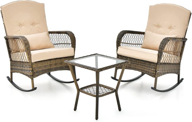 ——–Cet ensemble de 3 chaises à bascule d’extérieur soulagera efficacement votre fatigue. Composé de 2 chaises à bascule avec coussins et d’une table basse, cet ensemble de patio à bascule est parfait pour passer un moment de détente apaisant avec des amis. Chaque chaise est conçue de manière ergonomique et équipée de coussins et d’un oreiller pour un confort optimal. Se balancer sur la chaise est utile pour réduire le stress et apaiser l’esprit.