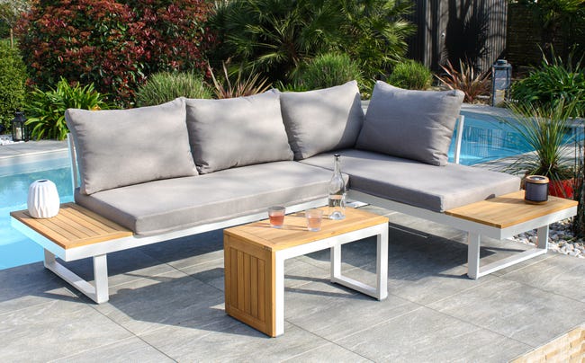 Le salon de jardin TOKYO en aluminium blanc est modulable à souhaits : le salon d’angle devient lit, sa table basse devient une console… Ses coussins déhoussables gris clair très épais sont la garantie d’un confort optimal. Ensemble composé de : une table basse plateau bois d’acacia, 2 méridiennes 2 places, 2 coussins d’assises déhoussables et 4 coussins de dossiers déhoussables