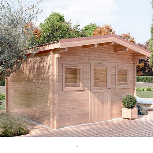 Notre Chalet de jardin ‘OUTRIAZ’ est moderne et robuste ! Avec ses madriers de 55mm et son toit plat, il ajoute une touche contemporaine à votre jardin. Fabriqué dans l’Ain par nos experts menuisiers, ses qualités de finitions et sa durabilité vous apporteront toute la sérénité pour profiter d’une pièce à vivre supplémentaire dans votre jardin. Ses 15,21m² d’emprise au sol vous permettent d’installer ce chalet sans avoir besoin d’un permis de construire et avec sa superficie de 12,88m² intérieure, il peut être utilisé comme une véritable pièce à vivre supplémentaire dans votre jardin, un atelier, un poolhouse ou encore une salle de sport ! Celui-ci est réalisé avec des madriers de 55mm d’épaisseur et du bois douglas issu de forêts Françaises durablement gérées . Le bois utilisé est le Douglas*, un bois naturellement durable et son épaisseur de 55mm vous garantit une longévité et une tranquillité face aux intempéries. Côté installation : le montage de nos chalets est facilité grâce à une notice qui détaille chaque étape avec soin et précision. Le studio de jardin ‘OUTRIAZ’ est proposé avec une porte simple, 2 fenêtres bois et avec une toiture bacacier pour une plus grande résistance aux intempéries et une meilleure durabilité. * Le bois Douglas des nos chalets est issu de forêts Française durablement gérées et ils sont 100% fabriqués en région Auvergne Rhone Alpes