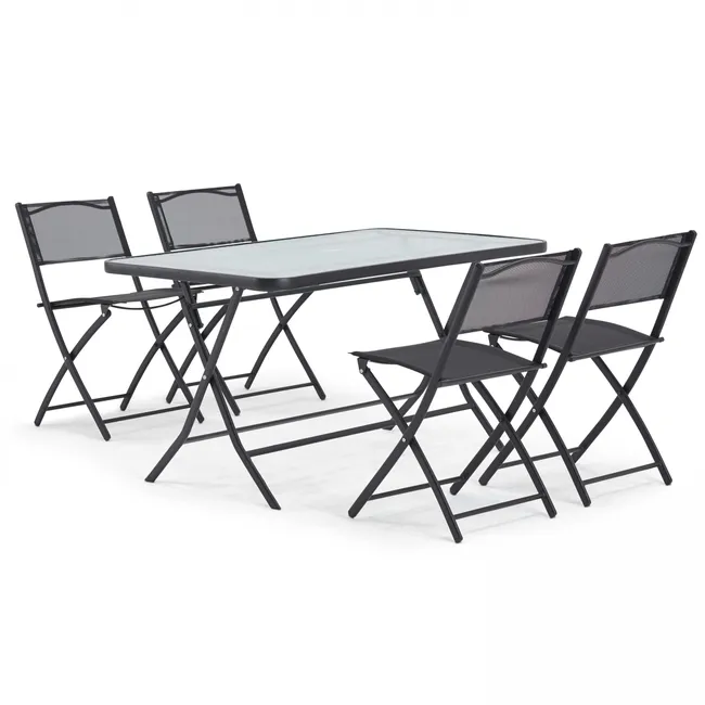 Table de terrasse et 4 chaises pliantes en acier et verre noir