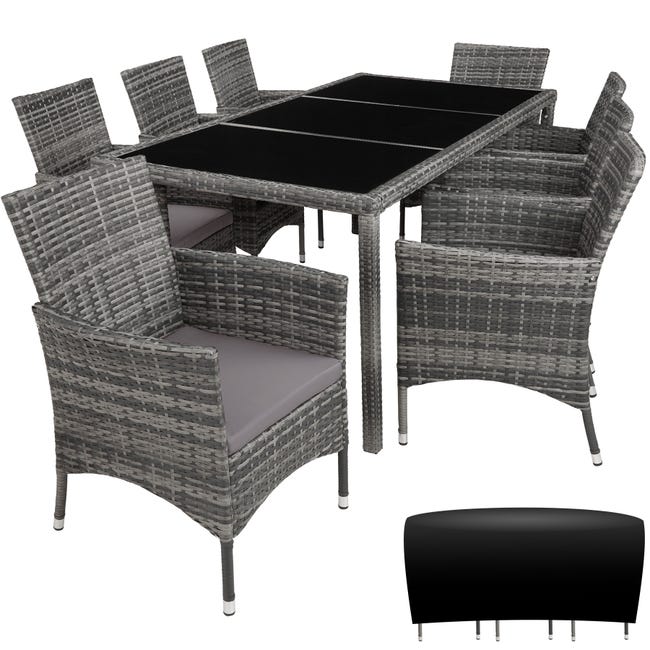 Tectake Salon de jardin 8 places avec housse de protection – gris tacheté/gris