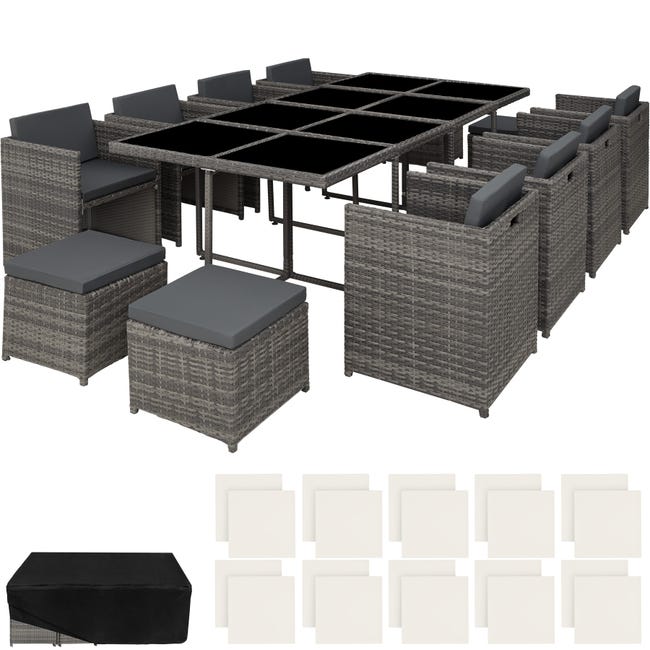 Invitez famille et amis à partager un agréable moment autour de notre salon de jardin NOUVELLE ORLEANS 12 places tectake ! A la fois compact et confortable, notre salon de jardin offre assez de places pour que 12 personnes puissent s’installer autour de la table en étant assises soit dans un fauteuil, soit sur un tabouret. Les tabourets peuvent également servir de repose pied après une balade ou profiter du soleil sur la terrasse. L’ensemble de jardin est encastrable : les dossiers des fauteuils se replient pour venir se glisser sous la table et rejoindre les tabourets. Une fois complètement rangé, le salon de jardin ne prend qu’un minimum de place. L’ensemble ira aussi bien dans votre jardin sur votre terrasse qu’à l’intérieur dans le salon ou dans une véranda. La structure des fauteuils, tabourets et table est en acier recouvert de résine tressée. Ce matériau – ressemblant au rotin naturel – s’entretien facilement et résiste aux intempéries. Une fois la belle saison passée, remisez votre salon de jardin recouvert de la housse de protection comprise dans la livraison. Deux sets de housses de coussins lavables avec revêtement hydrofuge sont également inclus dans le prix.