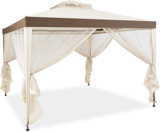 - La cadre de cette tonnelle de jardin est composée de fer massif. Grâce à son revêtement en poudre, tous les éléments en acier sont protégés contre la corrosion et les intempéries. La bâche est en polyester avec enduit PU supplémentaire et offre une protection contre la pluie et le soleil. De plus, notre tonnelle est munie d’une moustiquaire afin d’isoler les moustiques, son design élégant donne une touche de luxe au jardin. Elle est conçue pour être utilisé toute l’année, et les instructions de montage vous permettent de l’assembler rapidement.