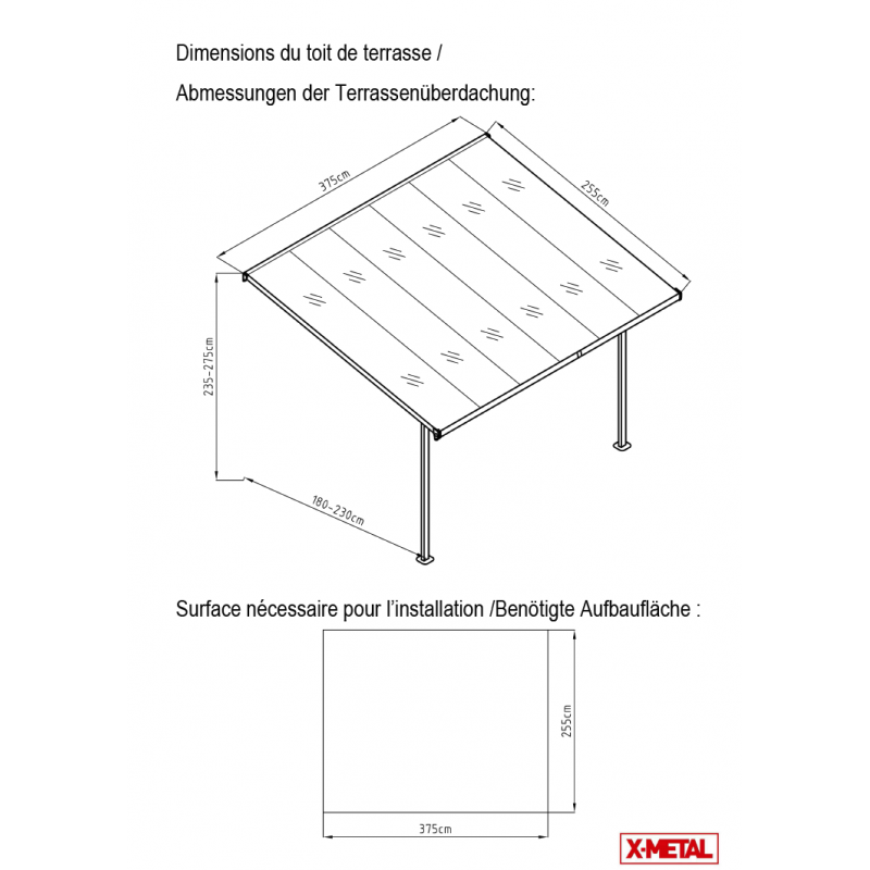 Ce toit de terrasse de 375cm de longueur et de 255cm de largeur fabriqué par X-Metal est un des plus petits de sa gamme, il couvre une surface de 9,56m². La structure massive en aluminium est recouverte d’une peinture multi-couches blanche, résistant à la corrosion.