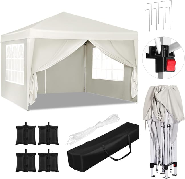 Tonnelle de Jardin 3x3m avec 4 Sacs de Sable,Tente Pliante Auvent Pliable,Hauteur Réglable,Imperméable Protection du Soleil UV 50+,Beige,WOLTU