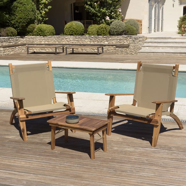 VICTOIRE – SALON DE JARDIN EN BOIS ACACIA 2 pers – 2 fauteuils et 1 table basse 63,5 x 36 cm